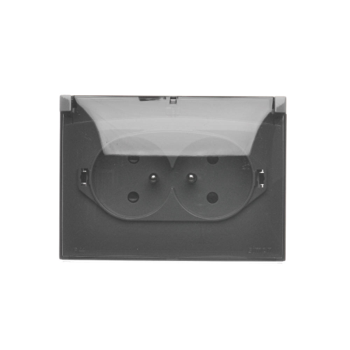 Double compact socket outlet with earthing IP44 version - transparent flap, 16A, Screw, dark grey