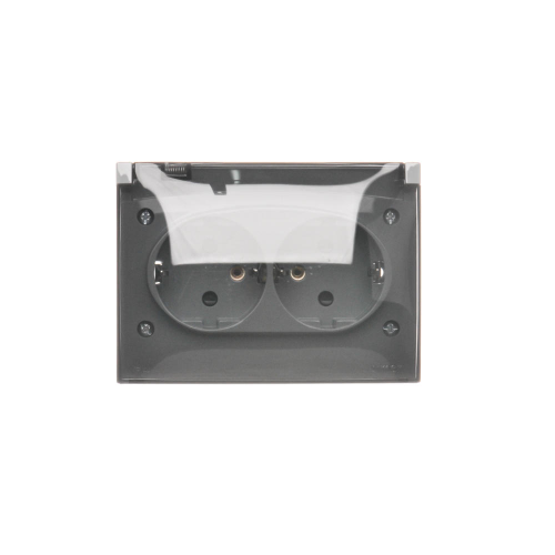 - Product name / Type: double compact socket outlet with SCHUKO earthing and shutters - IP44 version - transparent flap