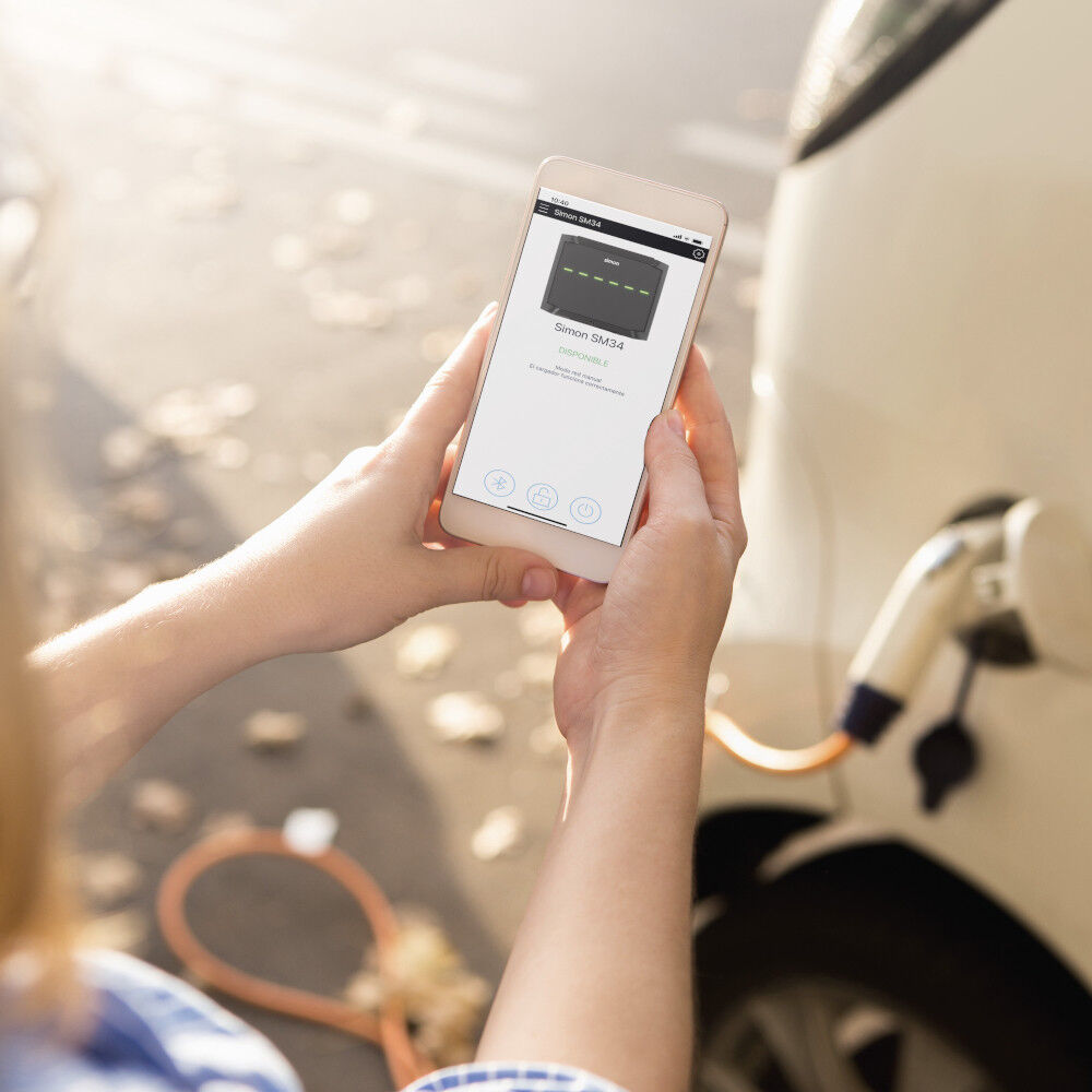 Electric vehicle charging station, Simon SM34, wall mounted, Single phase, 32A, 7.4kW, Type 2 straight charging cable, optional RFID, MID, 30mA, A type self-resetting earth leakage circuit breaker 40A, C type circuit breaker