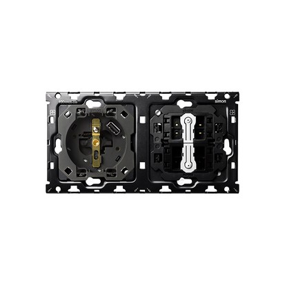 WITHDRAW FROM OFFER - Available while stocks last, double panels: 1 socket with 1 integrated SmartCharge 2.1 A USB charger + 2 keys, Simon 100, black
