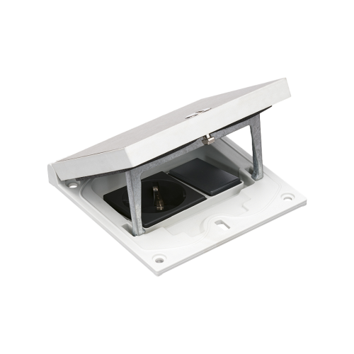 Floor box insert, inox steel, IP66, IK08, 2.5×K45, 2 sockets type F (schuko), 2 modules RJ45 cat. 6 UTP, easy access lock