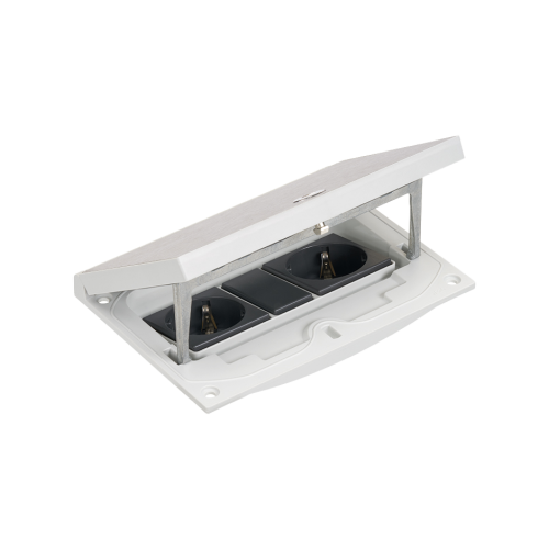 Floor box insert, inox steel, IP66, IK08, 2.5×K45, 2 sockets type F (schuko), easy access lock, blind element 22,5x45mm