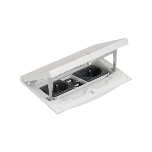 Floor box insert, inox steel, IP66, IK08, 2.5×K45, 2 sockets type F (schuko), 2 modules RJ45 cat. 6 UTP, easy access lock