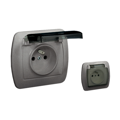 Gniazdo wtyczkowe pojedyncze z uziemieniem - w wersji IP44 - klapka z kolorze transparentnym, 16A, satynowy, metalizowany