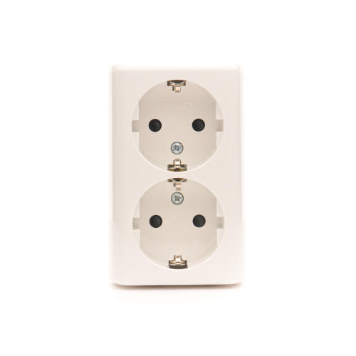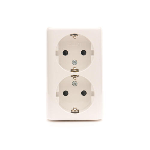 Gniazdo wtyczkowe podwójne z uziemieniem typu Schuko z przesłonami torów prądowych - wersja skandynawska, (kompletny produkt), 16A, 250V, zaciski śrubowe, biały