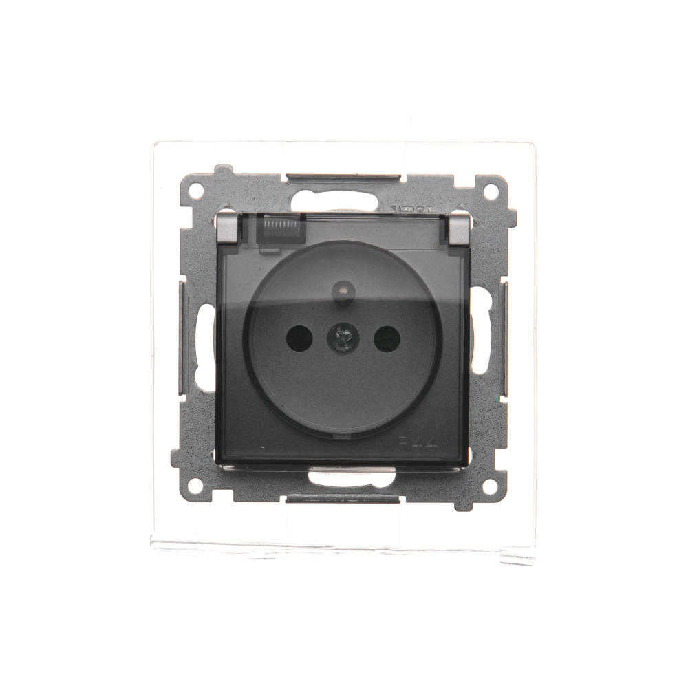 Gniazdo wtyczkowe pojedyncze do wersji IP44 - z uszczelką do ramek Premium - klapka w kolorze transparentnym, (moduł), 16A, 250V, zaciski śrubowe, antracyt, metalizowany