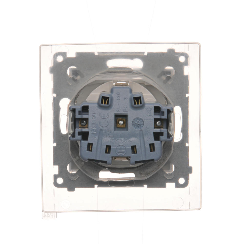 Gniazdo wtyczkowe pojedyncze do wersji IP44 z uziemieniem typu Schuko z przesłonami torów prądowych - z uszczelką ramki - klapka w kolorze pokrywy, (moduł), 16A, 250V, zaciski śrubowe, biały
