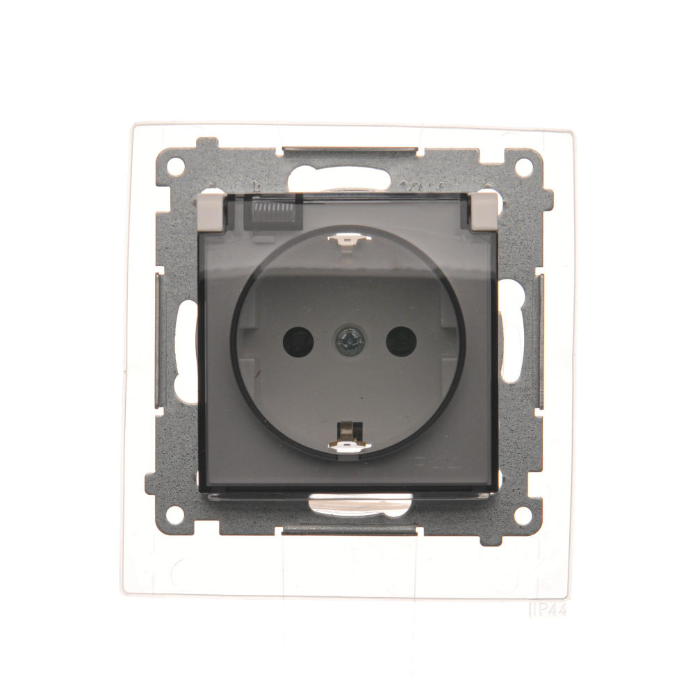 Gniazdo wtyczkowe pojedyncze do wersji IP44 z uziemieniem typu Schuko z przesłonami torów prądowych - z uszczelką ramki - klapka w kolorze transparentnym, (moduł), 16A, 250V, zaciski śrubowe, antracyt, metalizowany