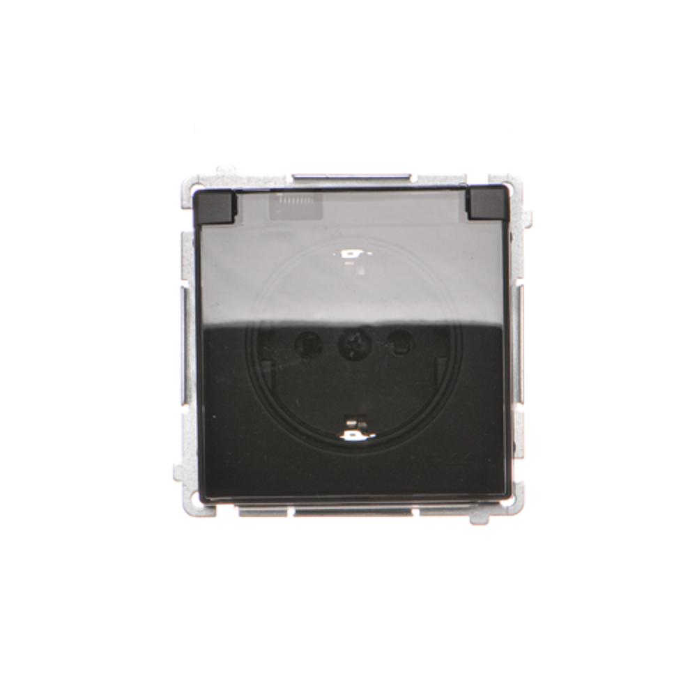 Gniazdo wtyczkowe pojedyncze do wersji IP44 z uziemieniem typu Schuko z przesłonami torów prądowych - bez uszczelki ramki - klapka w kolorze transparentnym, czarny mat, 16A