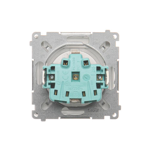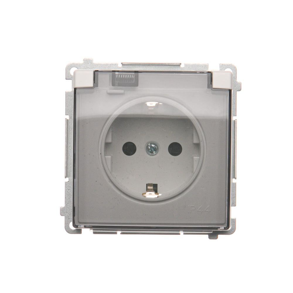 Gniazdo wtyczkowe pojedyncze do wersji IP44 z uziemieniem typu Schuko z przesłonami torów prądowych - bez uszczelki ramki - klapka w kolorze transparentnym, satynowy, metalizowany, 16A