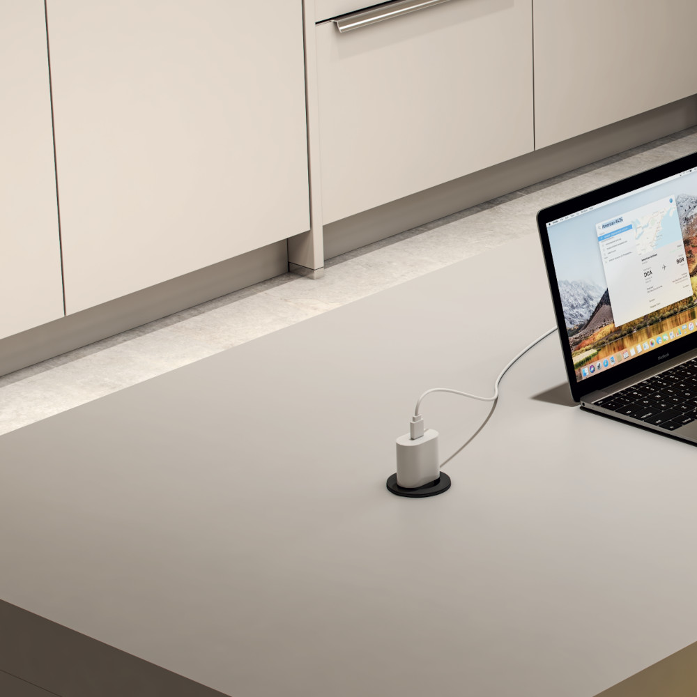 Gniazda wpuszczane pojedyncze - eleganckie, okrągłe gniazda przyłączeniowe i ładowarki USB A+C, które można estetycznie wbudować w powierzchnię mebli biurowych, sof lub foteli.
