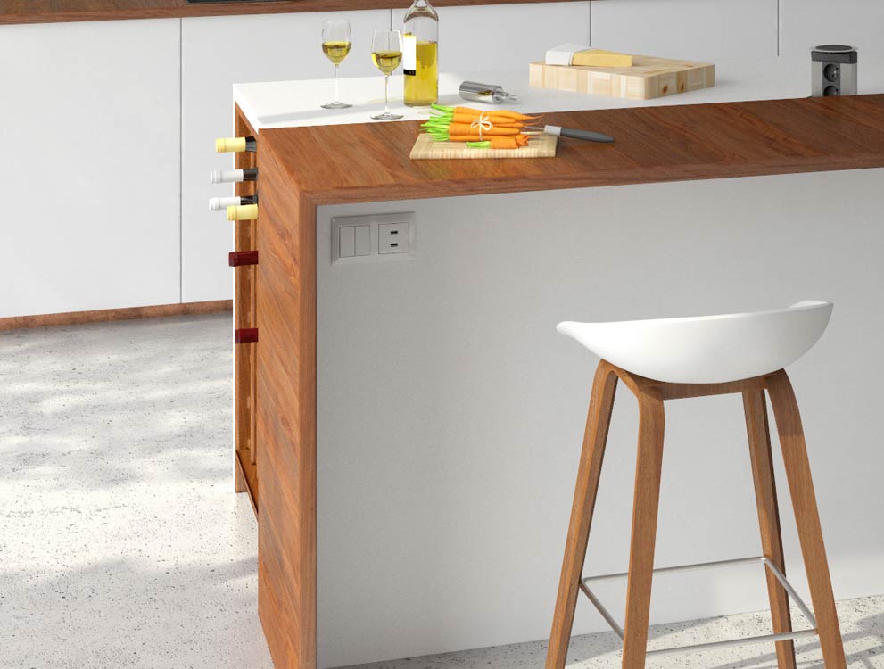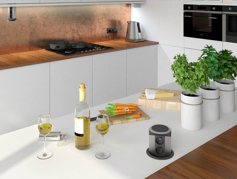 Teleblok umožňuje napájenie 2 až 6 zariadení v závislosti na dĺžke profilu. Dá sa inštalovať do kuchynské pracovnej dosky alebo do závesnej skrinky.