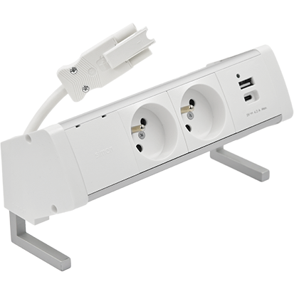Kancelárska zostava zásuvek: 2x 250 V typ E + USB A-C nabíječka, kabel 15 cm, hliník biela
