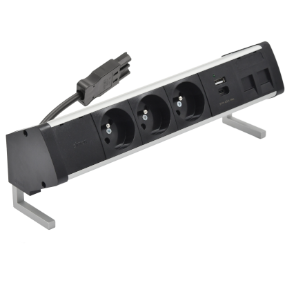 Kancelárska zostava zásuvek: 2x 250 V typ E + USB A-C nabíječka, kabel 15 cm, hliník čierny