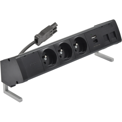 Zostava nábytkových zásuviek: 3x250V typ E+nabíj. USB A-C krytka 2xRJ45 s uchytením Keystone, kabel 15 cm, hliník čierny