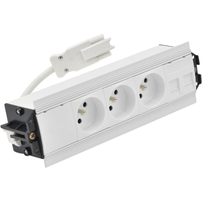 Mediaport Indesk: 3x250V typ E+ krytka 2xRJ45 s držiakom Keystone, kabel 15 cm, biela