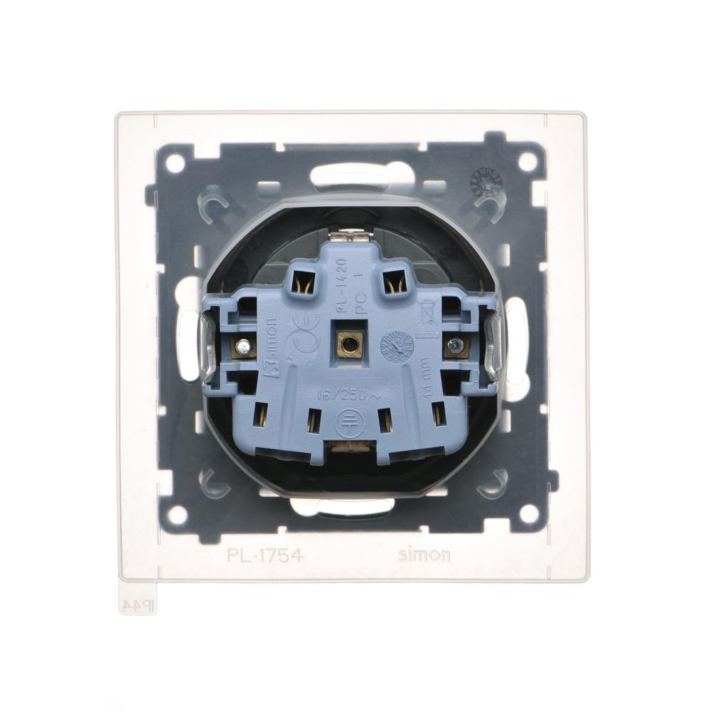 Jednotná kolíková zásuvka Schuko pre verziu IP44 s uzemnením typu - s tesnenia rámčeku - klapka vo transparentné farbe, prístroj s krytom, 16A, pružinové svorky, biela matná