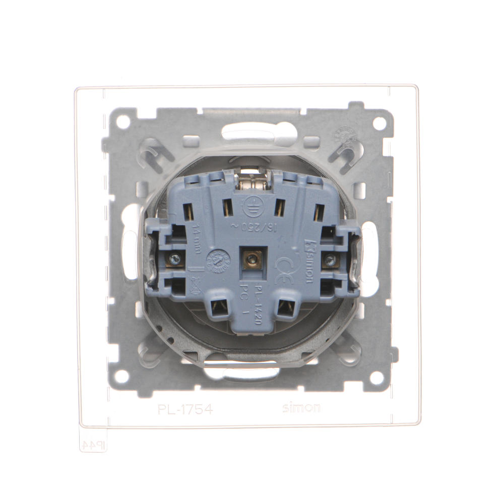 Jednotná kolíková zásuvka Schuko pre verziu IP44 s uzemnením typu - s tesnenia rámčeku - klapka vo transparentné farbe, prístroj s krytom, 16A, pružinové svorky, biela matná