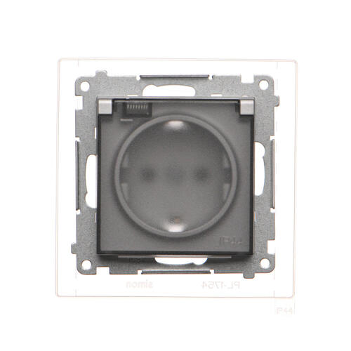 Jednotná kolíková zásuvka Schuko pre verziu IP44 s uzemnením typu - s tesnenia rámčeku - klapka vo transparentné farbe, prístroj s krytom, 16A, pružinové svorky, grafit matný