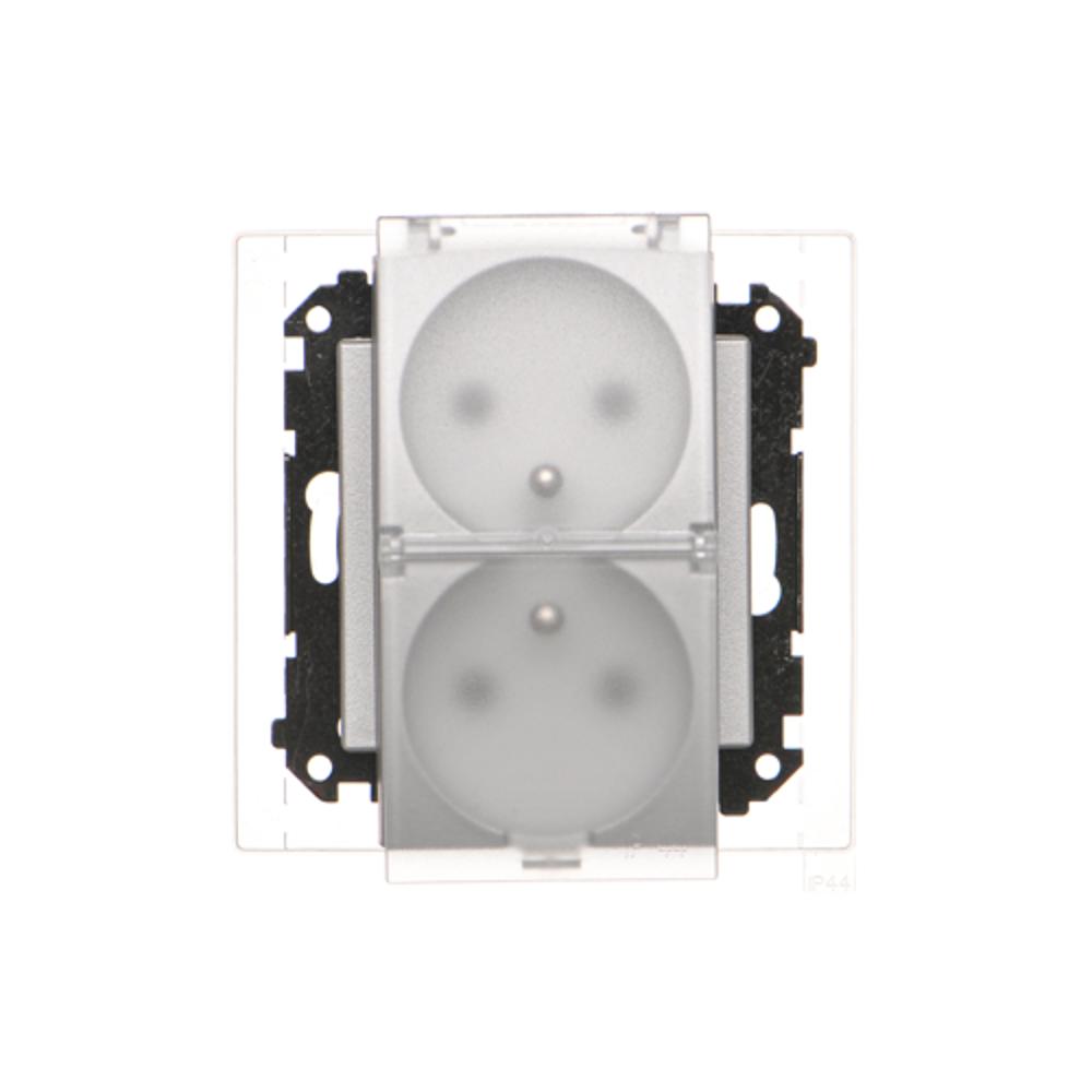 Zásuvka dvojitá pre verziu IP44 - s tesnením - transparentná klapka, prístroj s krytom, 16A, pružinové svorky, hliník matný