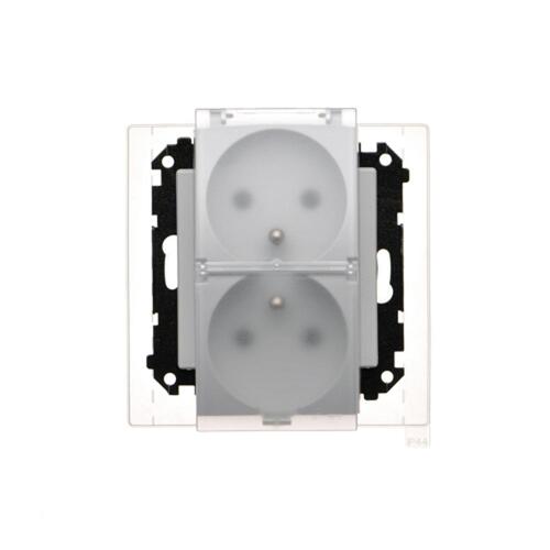 Zásuvka dvojitá pre verziu IP44 - s tesnením - transparentná klapka, prístroj s krytom, 16A, pružinové svorky, biela matná