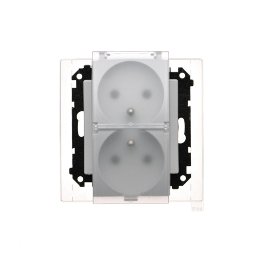 Zásuvka dvojitá pre verziu IP44 - s tesnením - transparentná klapka, prístroj s krytom, 16A, pružinové svorky, hliník matný