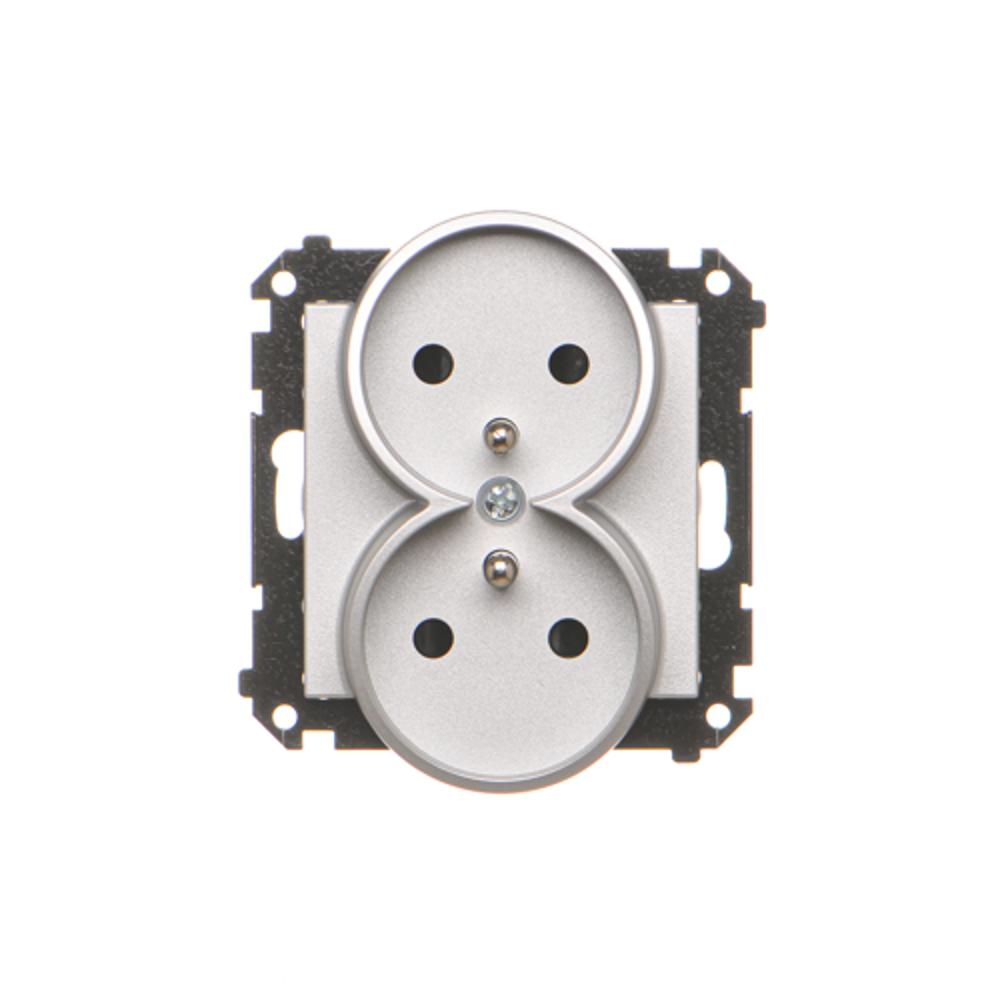 Dvojitá zásuvka bez uzemnenia s clonkami, prístroj s krytom, 16A, pružinové svorky, hliník matný