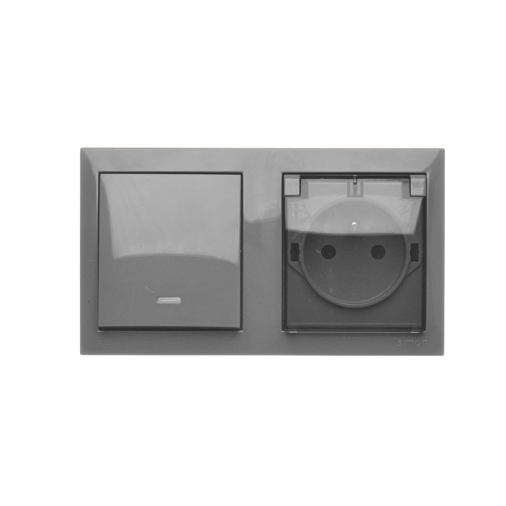 KONIEC VÝROBY - K DISPOZÍCII DO VYPREDANIA ZÁSOB, jedno zásuvka s krytím IP44 - klapka v transparentnej farbe - jednopólový spínač s orientačným podsvietením č.1/So s krytím IP44, (kompletný výrobok), Simon Aquaclick, IP44, 10AX, 16A, sivá
